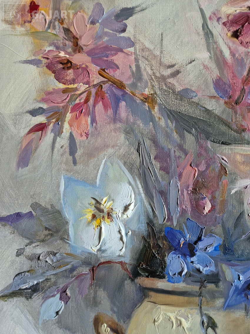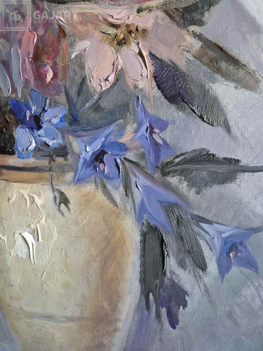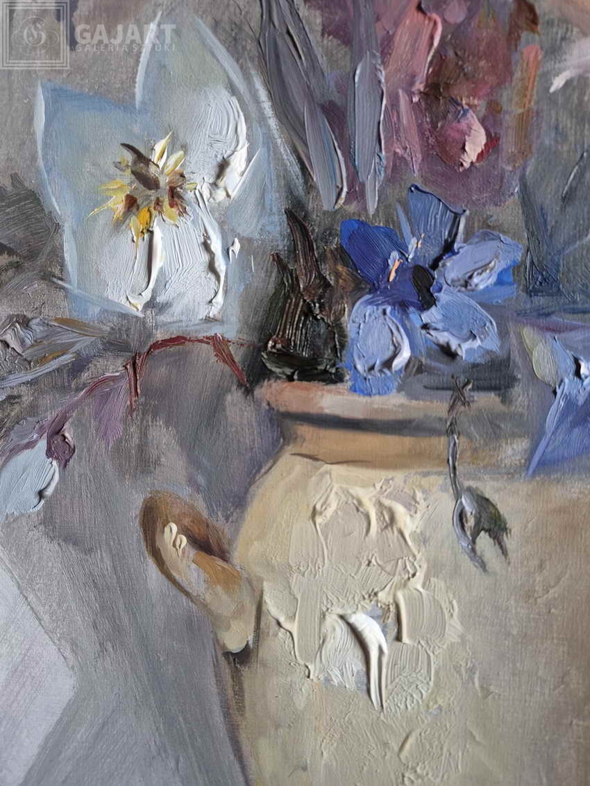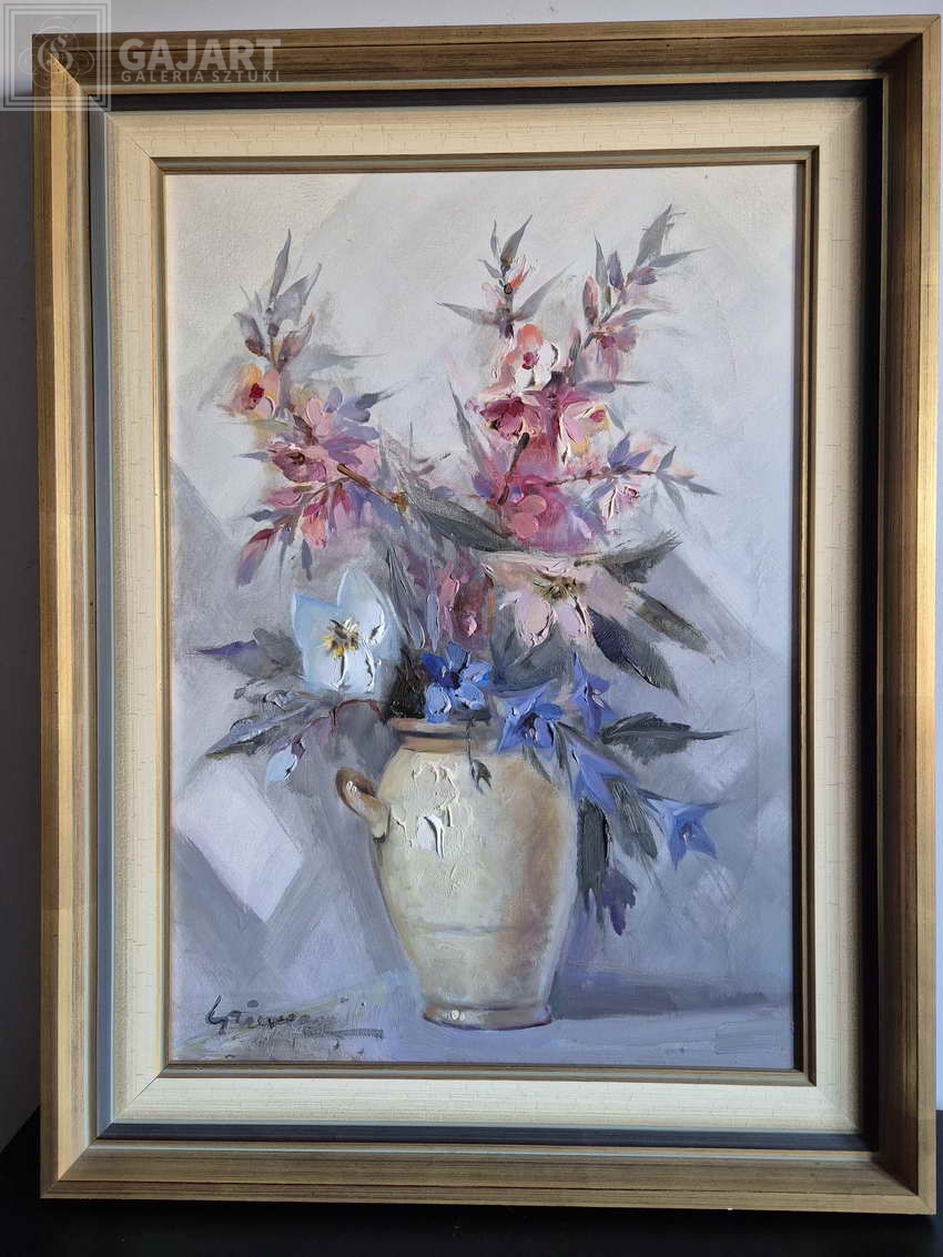Przedstawiamy następny piękny impresjonistyczny obraz w naszej galerii '' Kolorowe kwiaty'' namalowany przez włoskiego malarza Beppe Grimani. Bukiet kolorowych kwiatów w wazonie . Obraz malowany w technice szpachli, farba wyczuwalna pod palcami. Oryginalna kompozycja i piękne żywe kolory. Obraz oprawiony w drewnianą ramę pasującą do całości. Sygnowany w lewym dolnym rogu odręcznie przez malarza.
